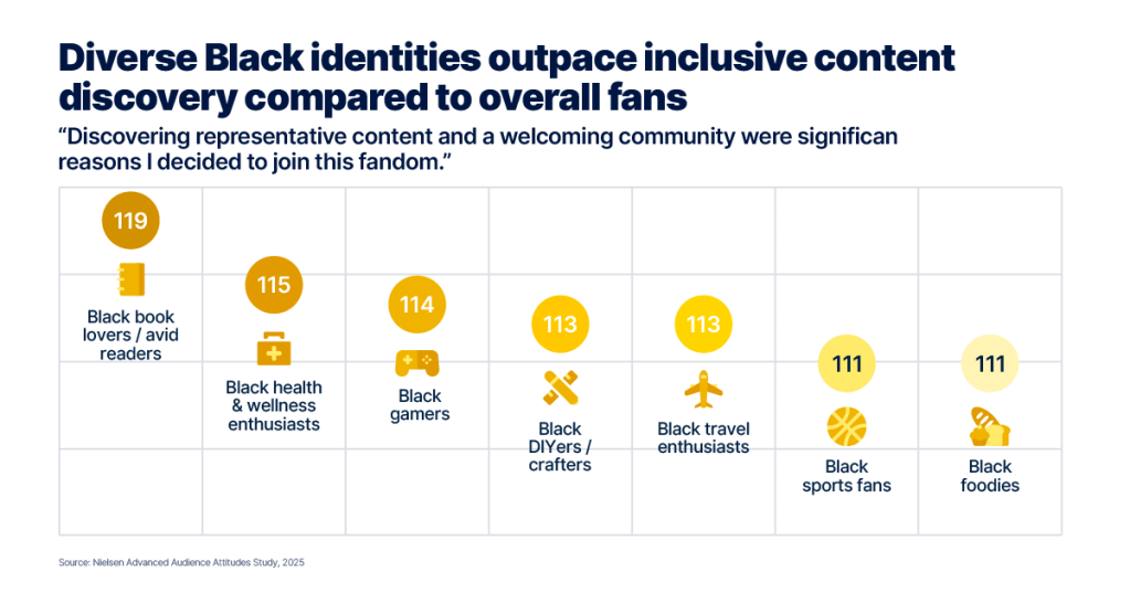 This series empowers the media industry with the expertise of Nielsen measurement solutions and insights to inform successful strategies, campaigns and programming. Centering the unique habits, segments and untapped power of Black audiences highlights the importance of cultural authenticity, inclusion and data . connecting through authentic representation. How Black audiences discover and discuss content is changing—so how brands win a share of Black consumers’ buying power is changing as well. But the throughline for attention, engagement and loyalty all start with authentic cultural representation and inclusion. Explore the highlights from our latest report: The Black identity cultural edge: Insights to drive authentic consumer engagement and loyalty
