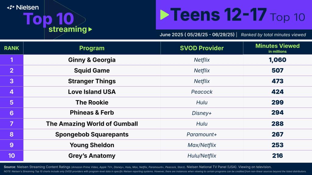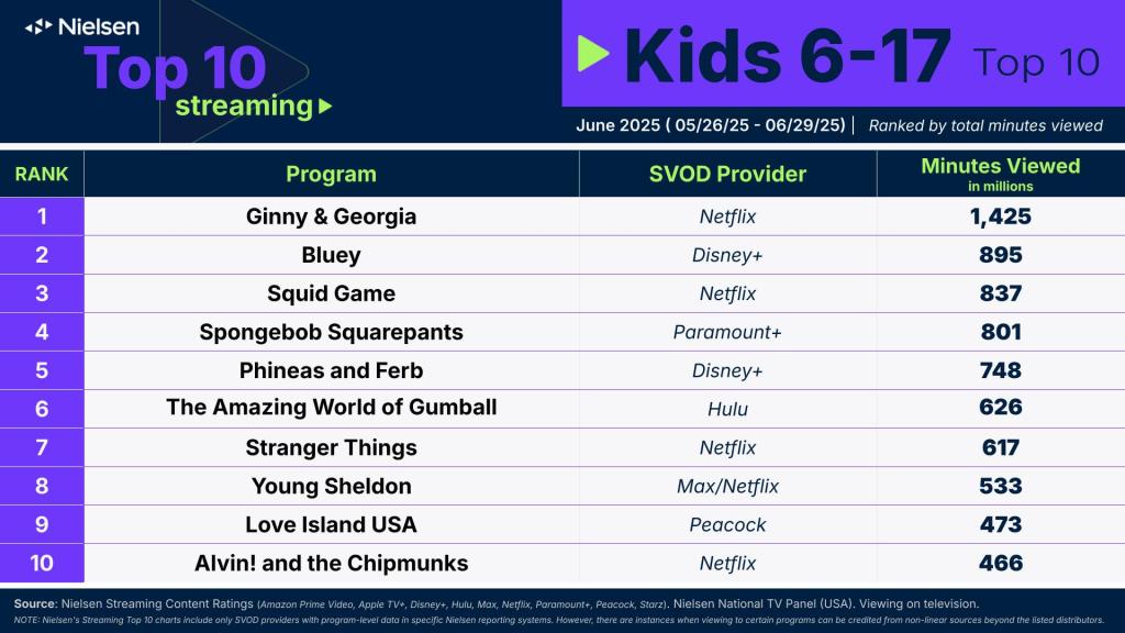 In addition to Bluey, Disney has two other shows make the top 10 among school-aged kids 6-17, starting with the recently revived Phineas & Ferb. Only a handful of new episodes came out in June, but it was a big enough boost to get the show to number five with 748 million minutes. The other entry was The Amazing World of Gumball (ranked sixth with 626 million minutes), which was originally a Cartoon Network property, but was licensed by Hulu a few years ago. Now, the streamer is queuing up a continuation series—dubbed The Wonderfully Weird World of Gumball—which will debut at the end of this month. That may well have had something to do with the show’s resurgence in June.