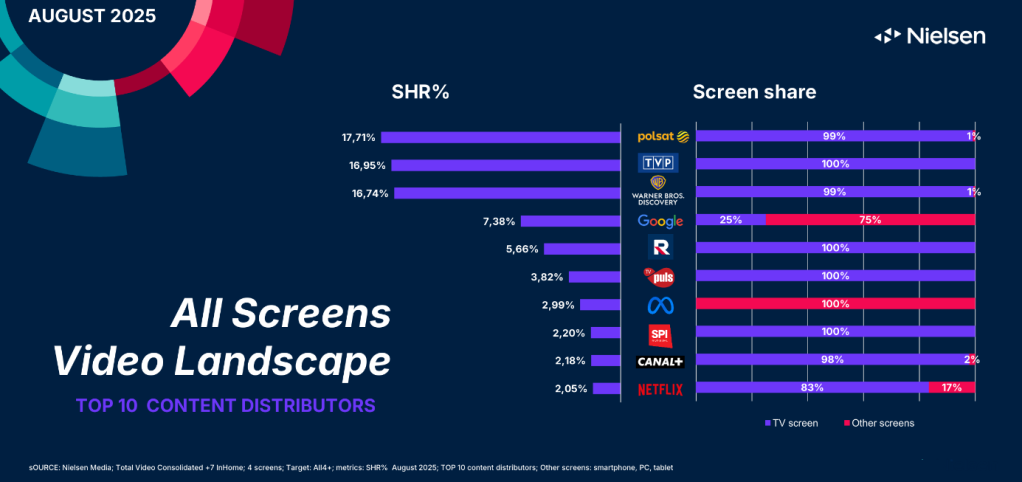 Warsaw, Poland, 21 September 2025: Nielsen, a global leader in audience measurement, data and analytics, has published its latest August All Screens Video Landscape report, covering viewership (a combination of total reach and time spent) across four screens: TVs, PCs/laptops, smartphones and tablets.
