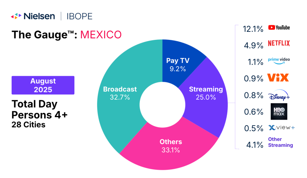W sierpniu udział streamingu w oglądaniu telewizji w Meksyku wzrósł o 0,4% w porównaniu z poprzednim miesiącem, odpowiadając za 25% oglądania telewizji.